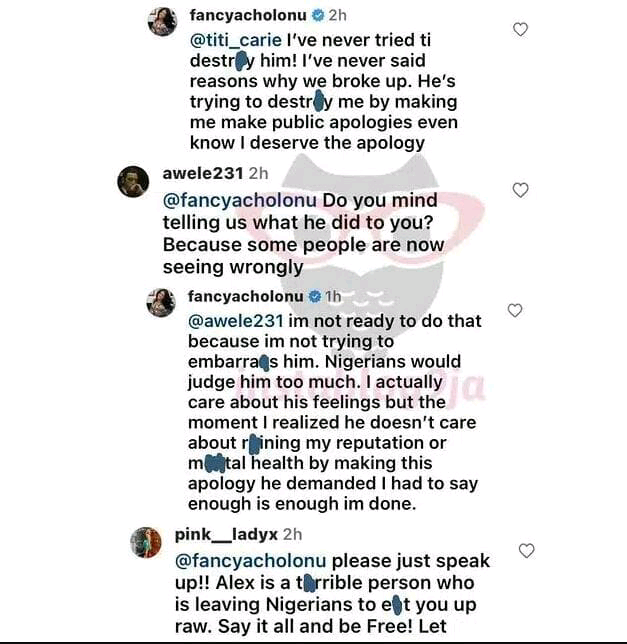More user asked their questions with awele231 asking: “@fancyacholonu Do you mind telling us what he did to you? Because some people are now seeing wrongly”