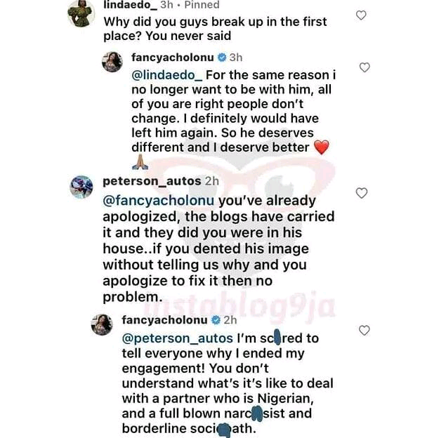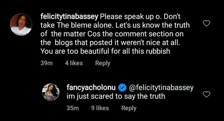 A couple of curious internet users deemed it fit to ask Fancy some questions regarding the matter, with an Instagram user asking Fancy to come clean about the real intent of the split, and that she shouldn’t take the entire blame of the whole schrade happening between her and Alexx Ekubo. Fancy Acholonu Fancy replied to this by admitting that she was undoubtedly afriad to say the truth.