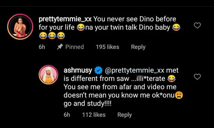 Replying harshly, Ashmusy wrote: “@prettytemmie_xx met is different from saw …illi*terate 😂