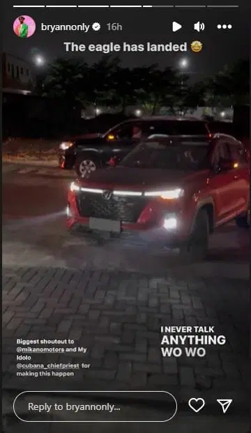 Recall that in October 2022, Cubana Chief Priest announced the purchase of a ride for Bryann via a post on his IG story.