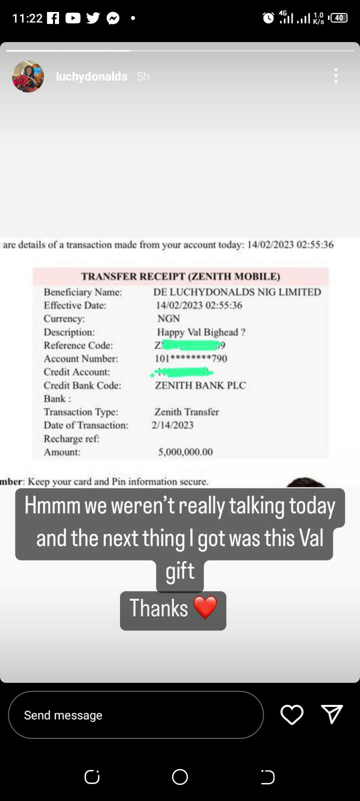 Nollywood actress Luchy Donalds posts pictures of the cash she received as a Valentine’s Day gift on social media.