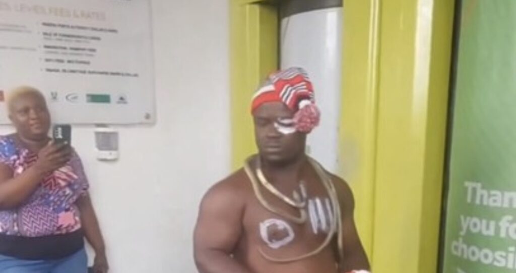 A tweep who shared the photos wrote, “Customers at one of Access Bank Branch were surprised to see a Native doctor in the bank trying to perform some magic so that he can enter inside the bank but he failed.