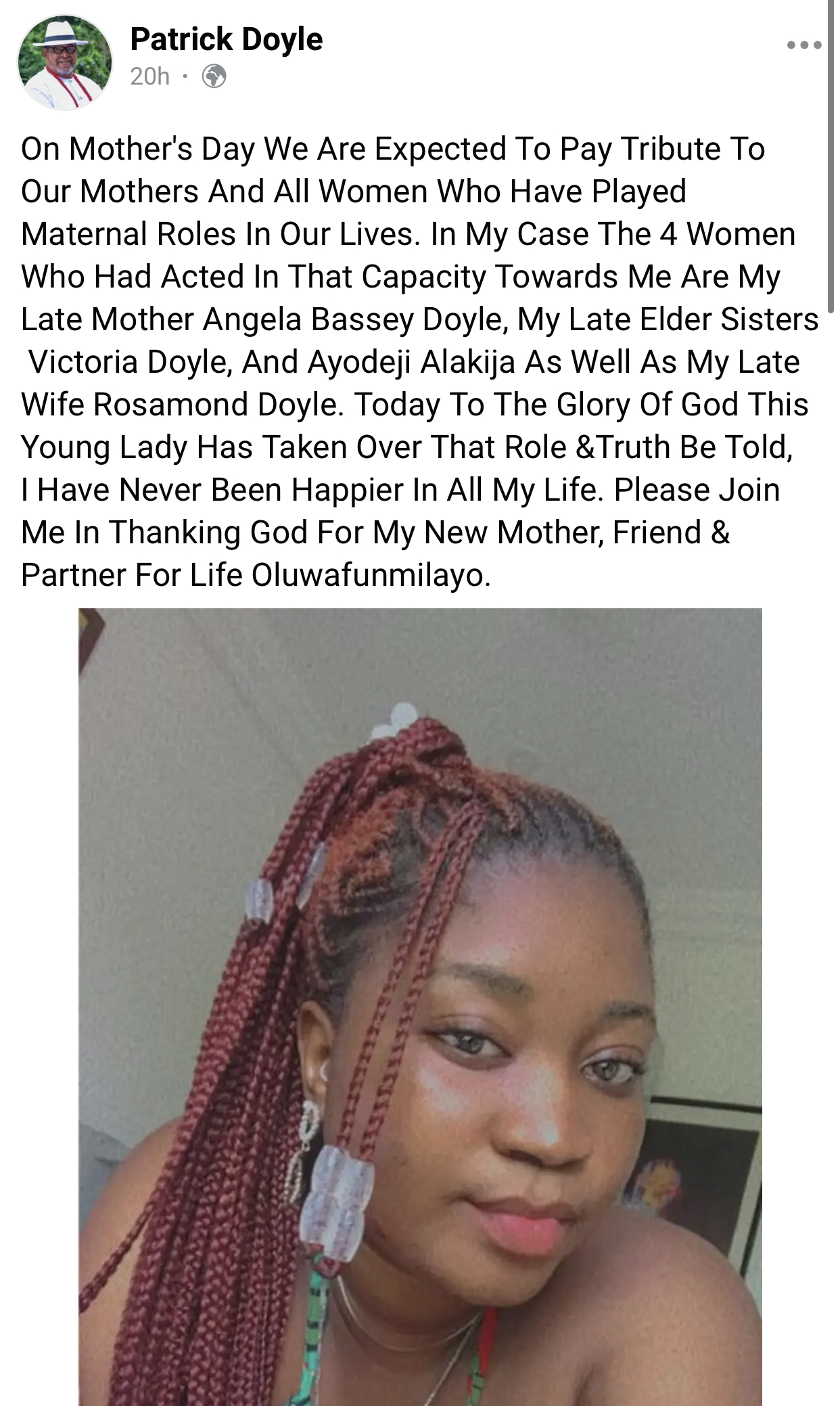 “Today To The Glory Of God This Young Lady Has Taken Over That Role &Truth Be Told, I Have Never Been Happier In All My Life. Please Join Me In Thanking God For My New Mother, Friend & Partner For Life Oluwafunmilayo.”