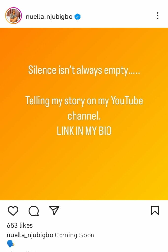 Nuella Njubigbo revealed on her Instagram page that silence is not always deafening, and she plans to share her story on her YouTube channel.