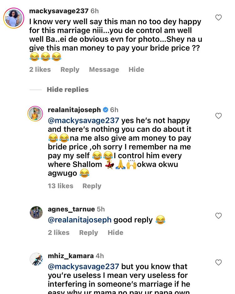 In her words: “Yes he’s not happy and there’s nothing you can do about it. Na me also give am money to pay bride price. Oh sorry I remember na me pay my self. I control him everywhere Shallom. Okwa Okwu agwugo.”