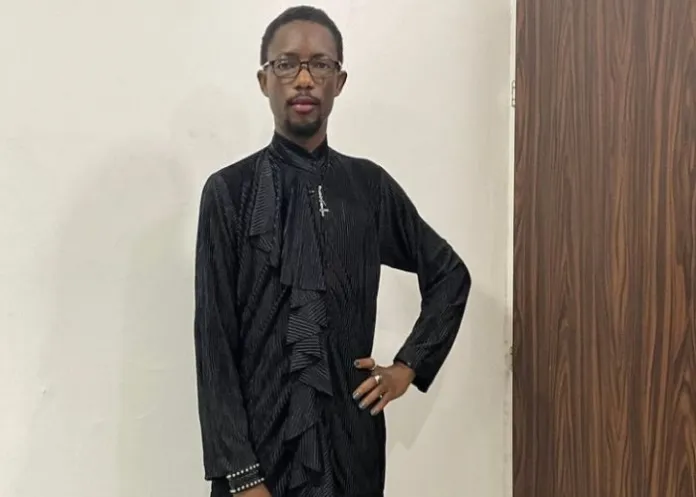 Olubi was dressed in a black outfit with pleats running down the front from the neckline. He also used makeup, including lipstick.