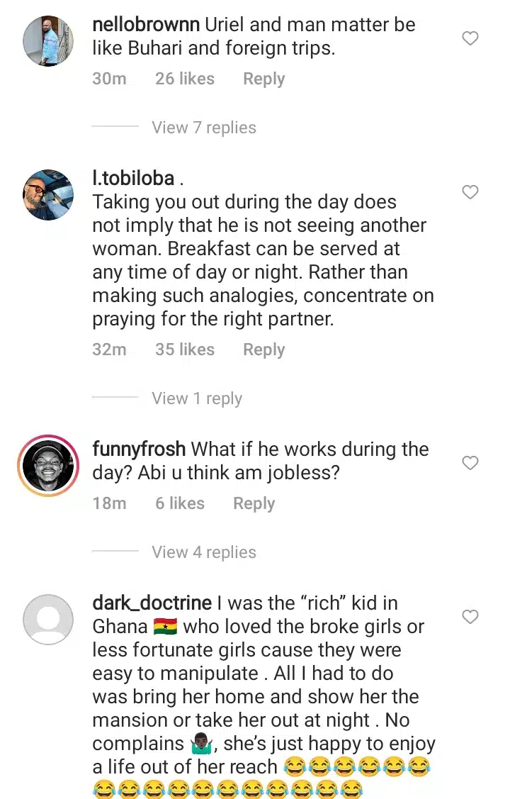 I.tobiloba wrote: “Taking you out during the day does not imply that he is not seeing another woman. Breakfast can be served at any time of day or night. Rather than making such analogies, concentrate on praying for the right partner.”