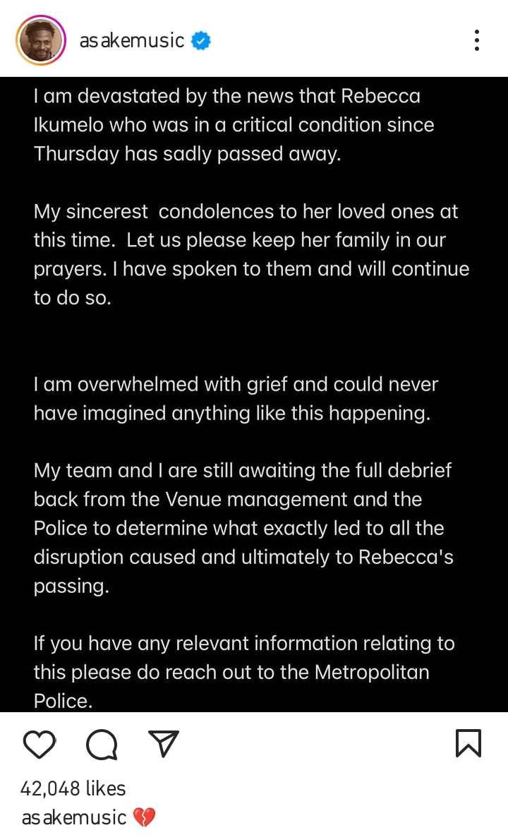 Asake, who is speechless, expressed his condolences to her family and friends on his Instagram page.