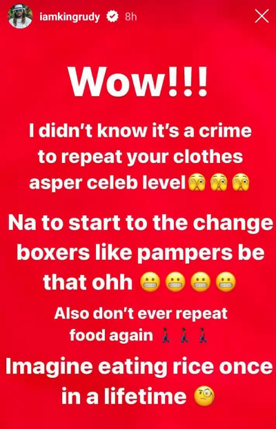 Wow! I didn’t know it’s a crime to repeat your clothes as per celeb level. Na to start to dey change boxers like Pampers be that ohh. Also, don’t ever repeat food again. Imagine eating rice once in a life time. Also I forgot, don’t repeat cars and houses. Maka celeb.
