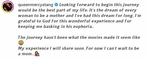 The Akwa-Ibom-born philanthropist expressed pure adoration and amusement, as she embarks on this new phase of her life. She made it clear in the caption she made on Instagram, stating that she was looking forward to the journey of motherhood, and also expressed gratitude to God for the experience.