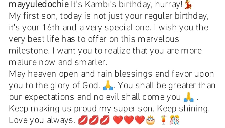 May Yul Edochie, the stunning wife of actor Yul Edochie, wrote a moving birthday message for her son Kambi, who turns 16 today.