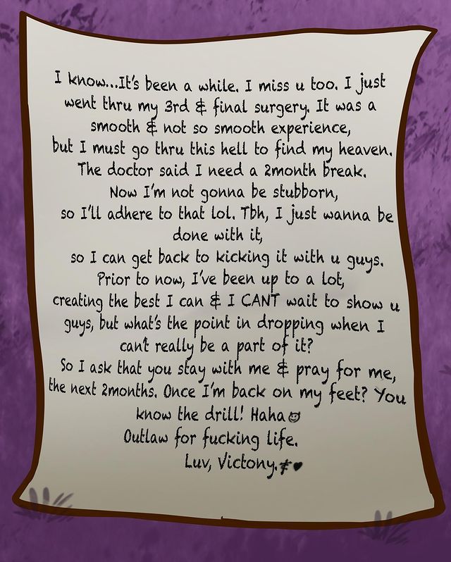 Victony revealed in his first post of the year that he had just undergone his third and final surgery and that the doctor had advised him to take a two-month break. He further pleaded with his supporters to support him for the next two months while he recovered.