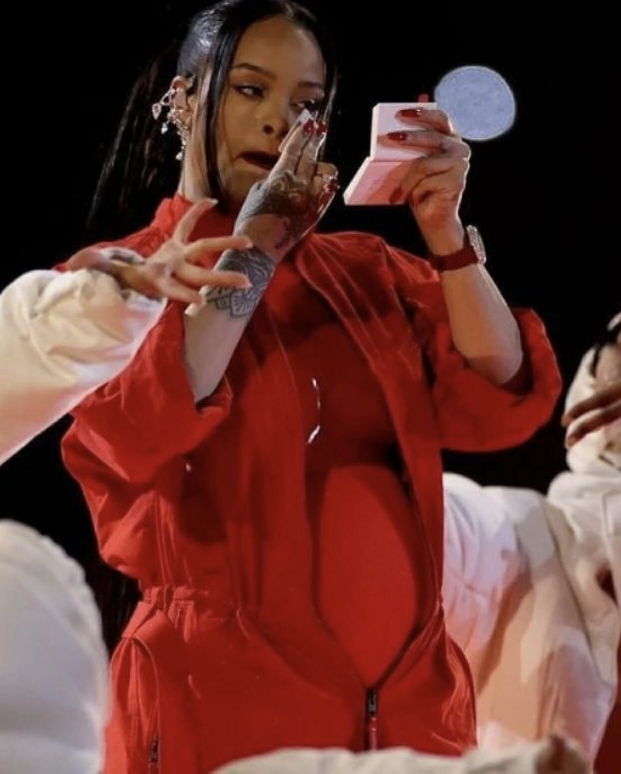 In one of the videos, a red-clad Rihanna took off her jacket to reveal her growing belly.