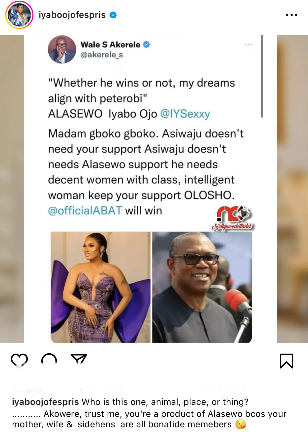 Wale Akerele further called Iyabo Ojo, a prostitute over her choice of candidate. Sharing his post and slamming him in response, the actress wrote: