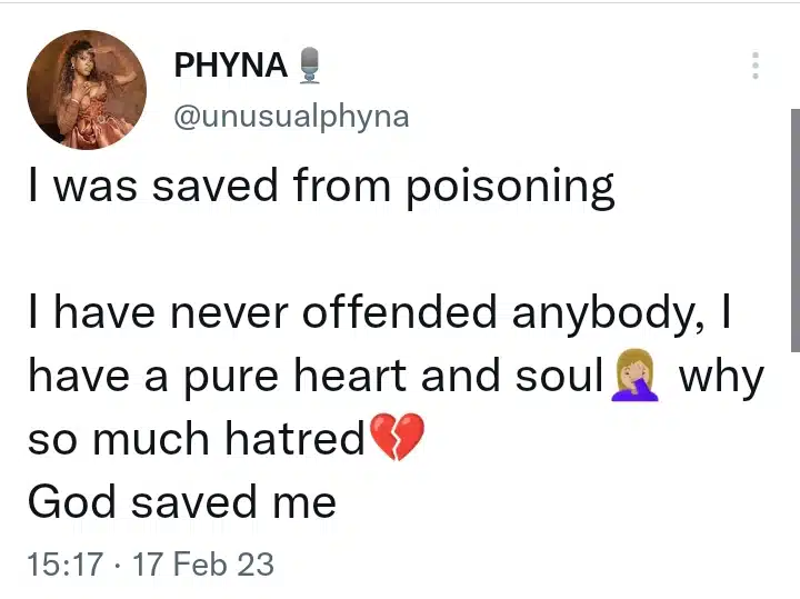 Big Brother Naija ‘Level Up’ winner, Phyna has spoken up after she was almost poisoned by someone.