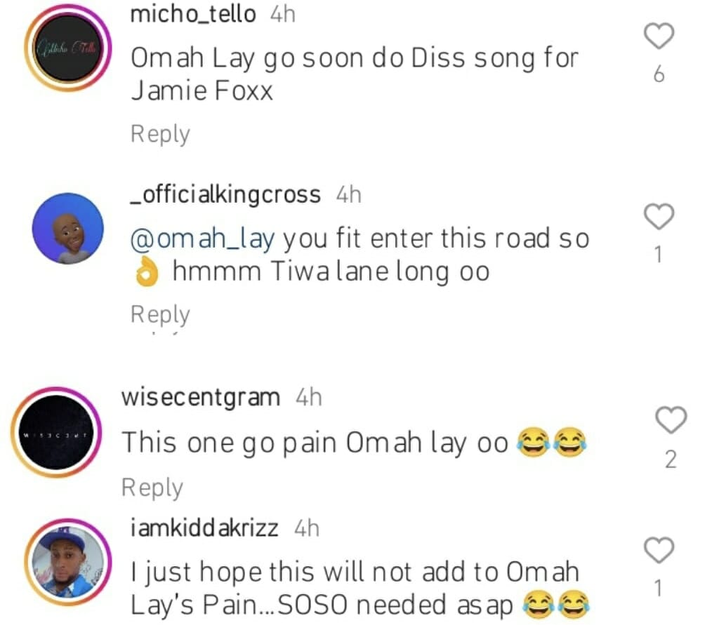 Nigerians have expressed concern for singer Omah Lay after seeing his crush, Tiwa Savage, with American actor Jamie Foxx.