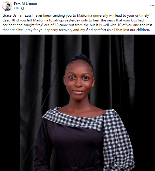 Loved ones have taken to Facebook to mourn the dead. One of the victims has been identified as Grace Usman Ezra.
