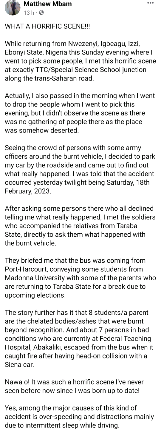 On the evening of Saturday, February 18, a bus transporting Madonna students home crashed and caught fire at the TTC/Special Science School junction along the trans-Saharan road in Abakiliki, Ebonyi State.