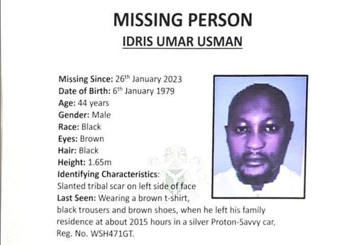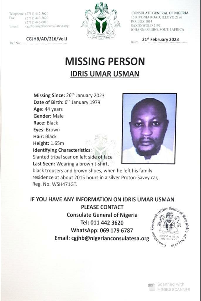 Usman has been missing since the 26th of January 2023, when he left his residence in a silver Proton-Savvy car, according to the Nigerian consulate.