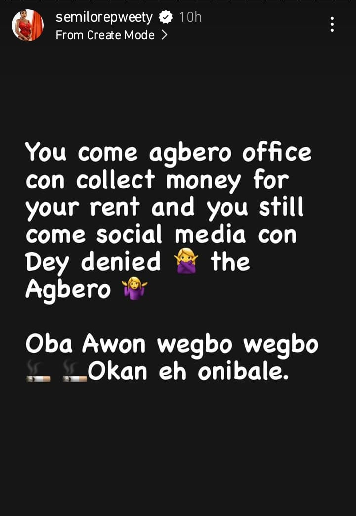 Taking to her Instagram story, Kudirat also claimed that Adunni had collected money from MC Oluomo for her rent, but was denying him in public.