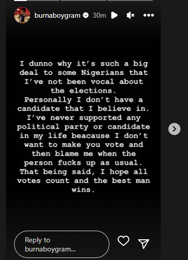 The Grammy winner wondered why Nigerians anticipate hearing from him regarding the elections on his Instagram story.