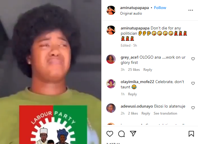 Well, following Peter Obi’s loss and Tinubu’s victory, Aminatu Papapa has taken to her Instagram page to mock Adunni Ade.