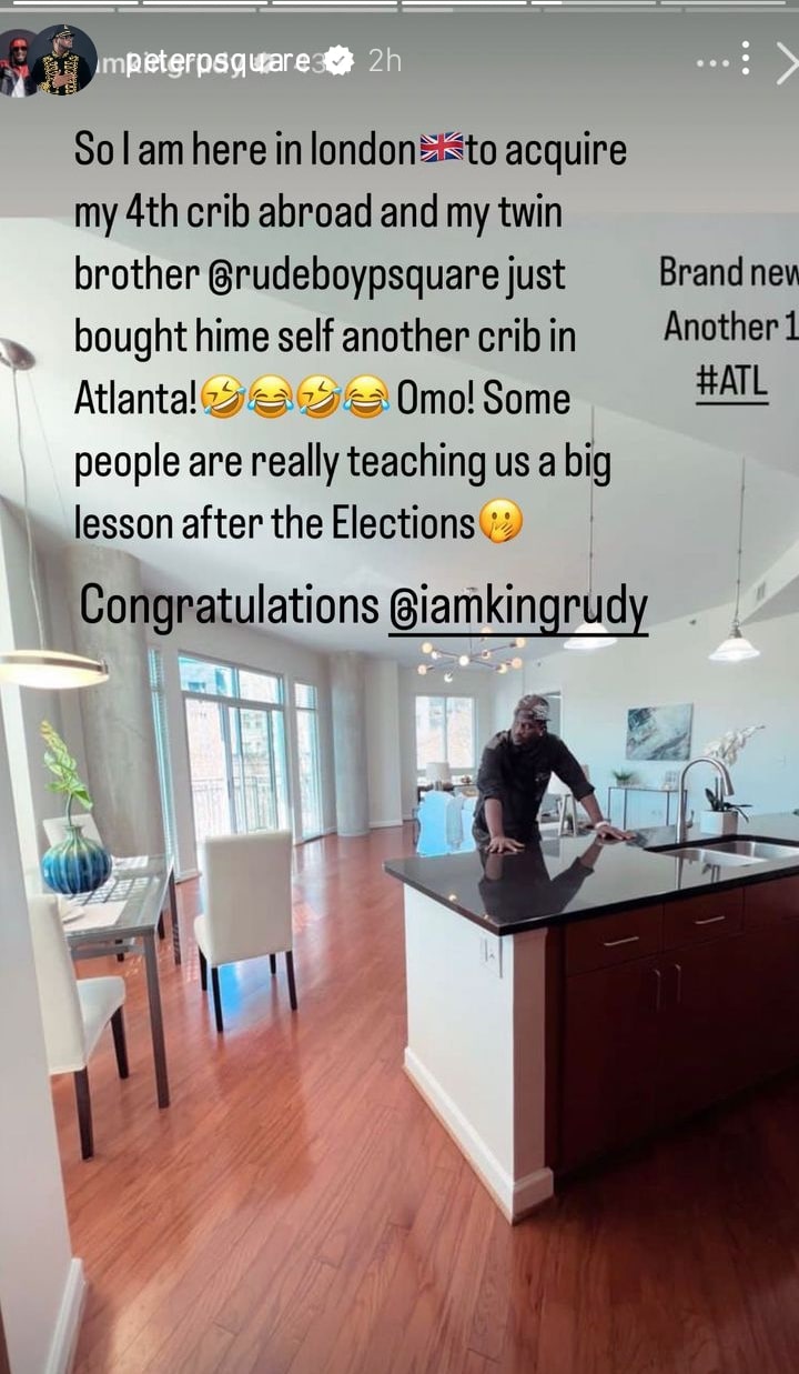 “So I am here in London to acquire my 4th crib in abroad and my twin brother @rudeboypsquare just bought home self another crib in Atlanta! Omo! Some people are really teaching us a big lesson after the Elections.”
