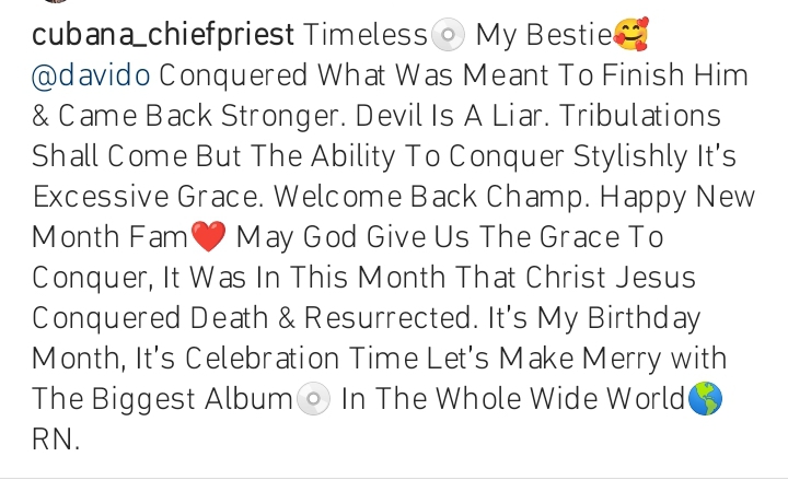 “Timeless. My Bestie @davido conquered what was meant to finish him & came back stronger. Devil is a liar. Tribulations small come but the ability to conquer stylishly it’s excessive grace. Welcome back champ. Happy new month fam. May God give us the grace to conquer, it was in this month that Christ Jesus conquered death & resurrected. It’s my birthday month, it’s celebration time. Let’s make merry with the biggest album in the whole wide world. RN”.