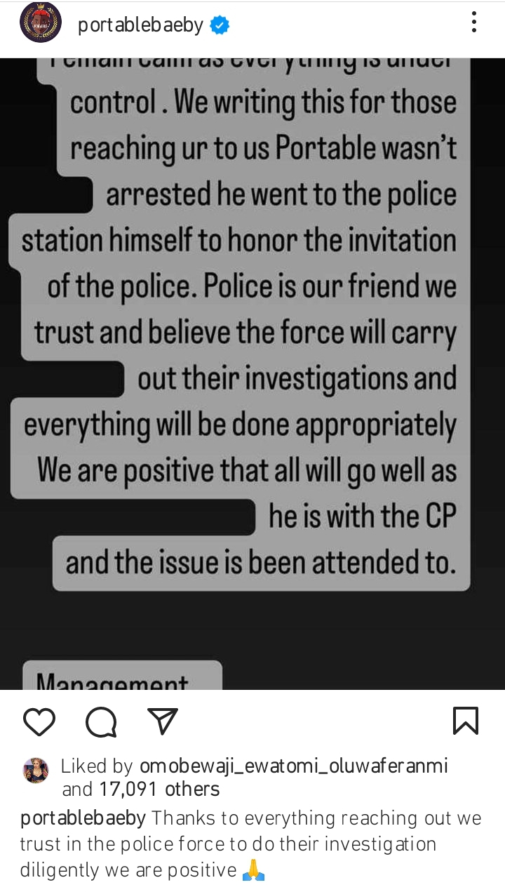 “Remain calm as everything is under control. We writing this for those reaching out to us Portable wasn’t arrested he went to the police station himself to honor the invitation of the police. Police is our friend we trust and believe the force will carry out their investigations and everything will be done appropriately. We are positive that all will go well as he is with the CP and the issue is been attended to”.