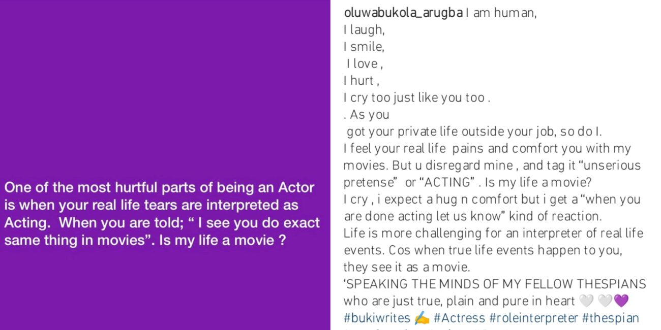 In a lengthy Instagram post, Damola Olatunji’s estranged wife revealed that one of the most painful aspects of being an actor is the inability of people to distinguish between reality and scripted life.