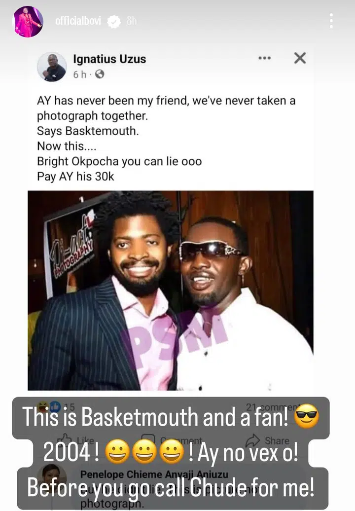 “This is Basketmouth and a fan! ???? 2004! Ay no vex o! Before you go call Chude for me!” he wrote.
