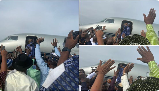Others present were James Faleke, Senator Magnus Abe, Senator Jibrin Barau, and Senator Dayo Adeyeye. He was also received by a crowd of jubilant supporters.
