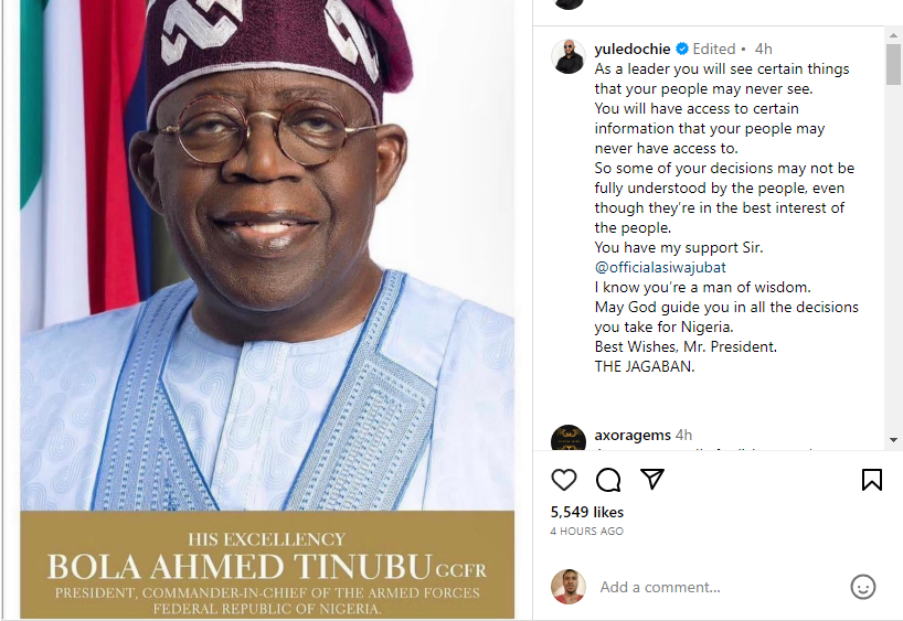 Yul posted this message on Instagram with a picture of Tinubu on Monday.