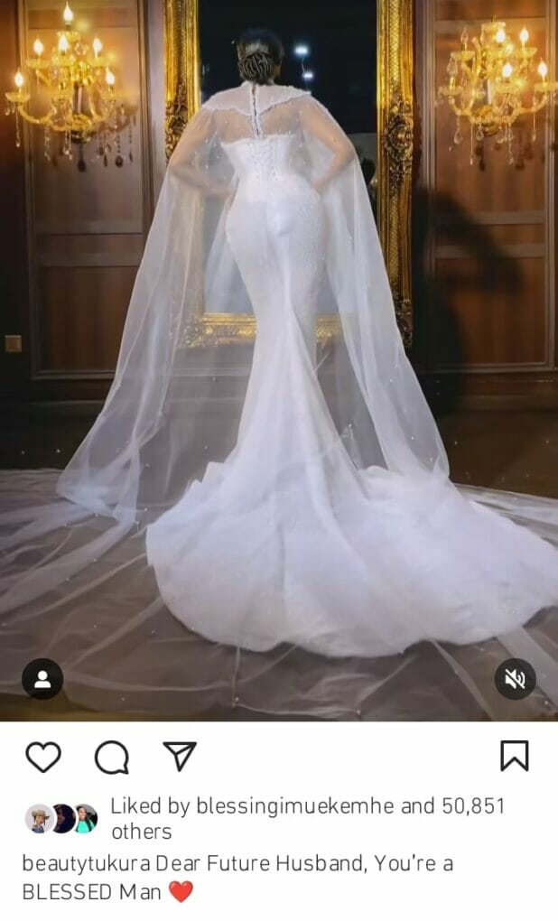 Beauty took to Instagram to share a video of herself in a bridal gown, noting how lucky her man is to have her as his future wife.