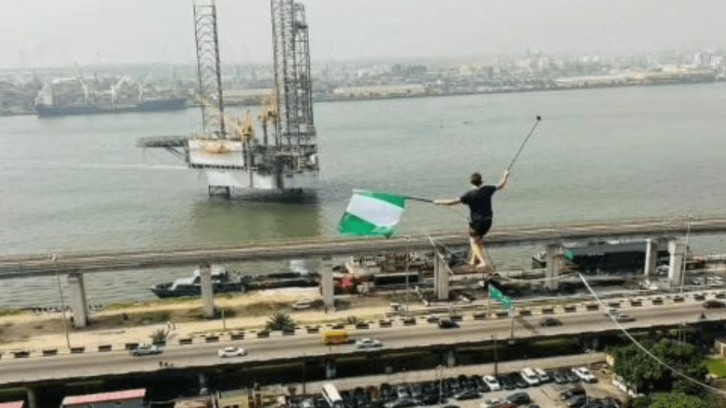 Estonian slackliner and Guinness World Record holder Jaan Roose on Thursday walked on a rope from Sterling Towers in the Marina area of Lagos to the Onome Rig.