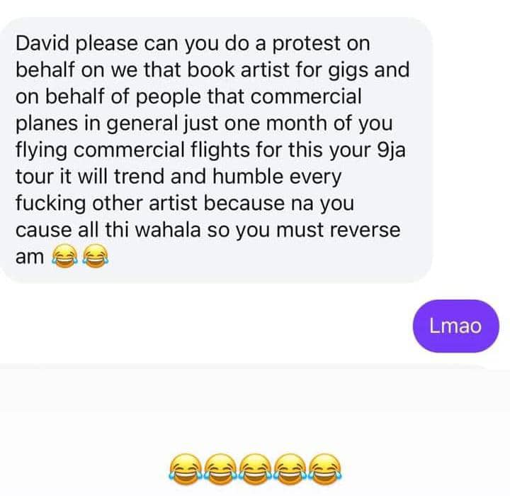 “David, please can you do a protest on behalf of us that book artists for gigs and on behalf of people who fly commercial planes in general. Just one month of you flying commercial flights for this, your 9ja tour. It will trend and humble every fucking other artist because na you cause all this wahala. So you just reverse am.”