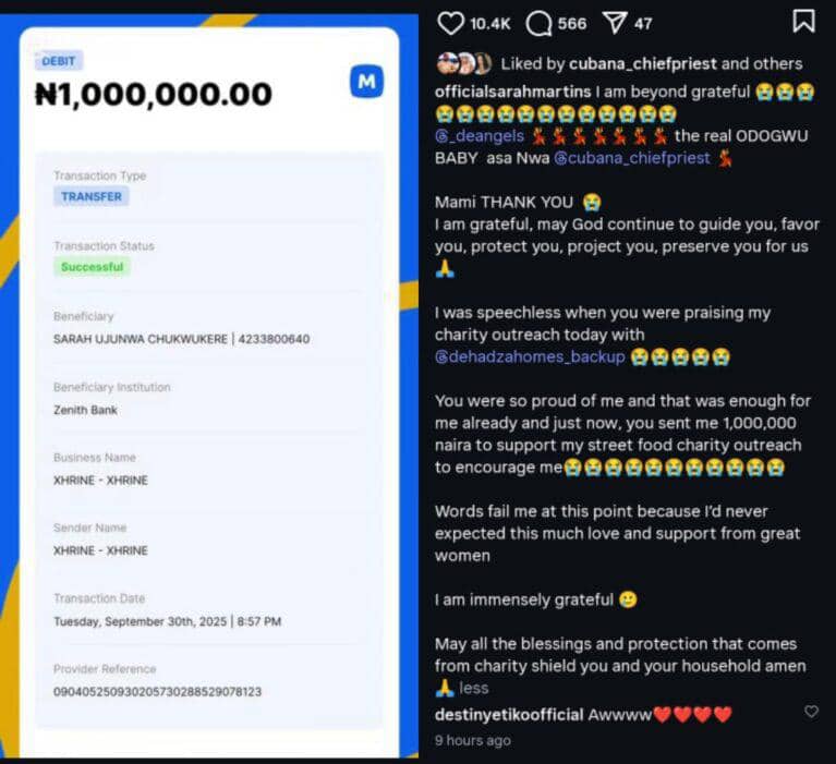 The Asaba-based actress, who has been actively involved in food charity outreaches, shared her joy on Instagram after receiving a ₦1 million donation from De Angels to encourage her street food initiative.