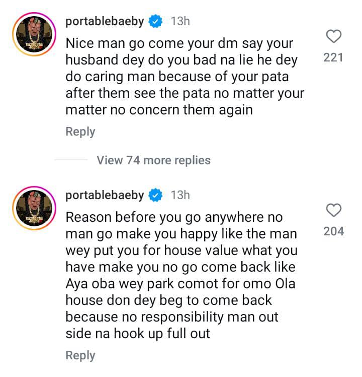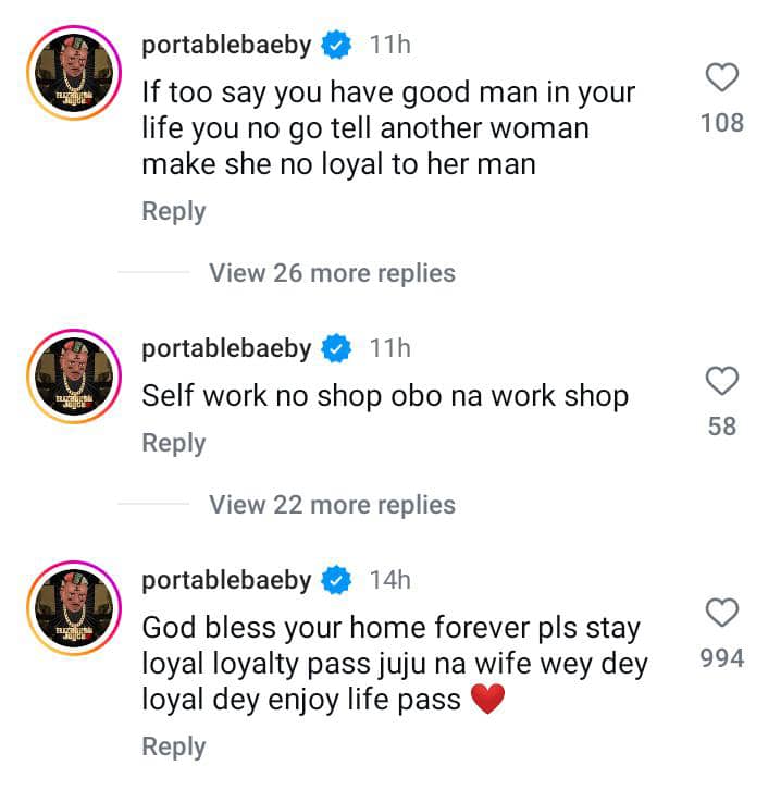 Portable made his remarks under Regina’s recent Instagram post, where she shared stunning photos of herself with the caption: “Even when the table turns, we go still dey chop for the table.”