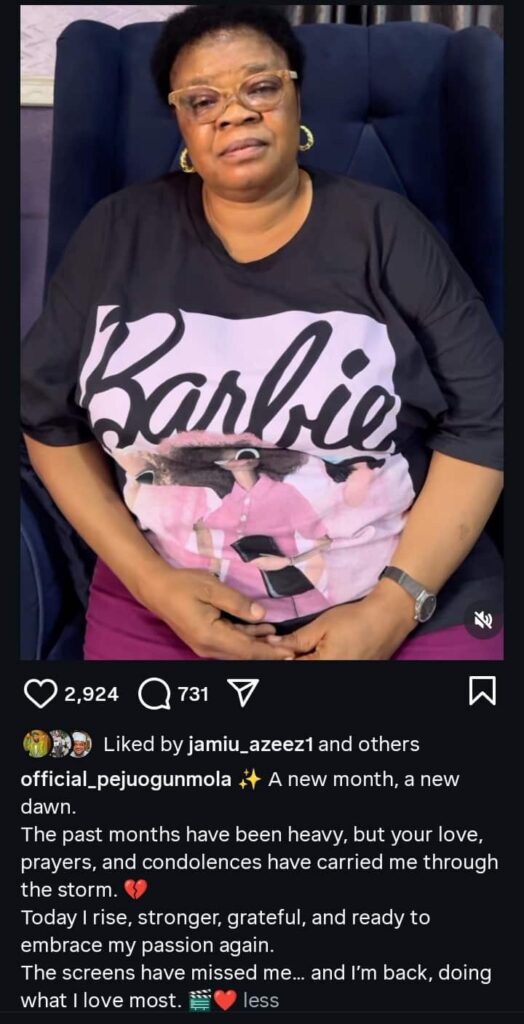 “A new month, a new dawn. The past months have been heavy, but your love, prayers, and condolences have carried me through the storm. Today I rise, stronger, grateful, and ready to embrace my passion again. The screens have missed me… and I’m back, doing what I love most”, she said.